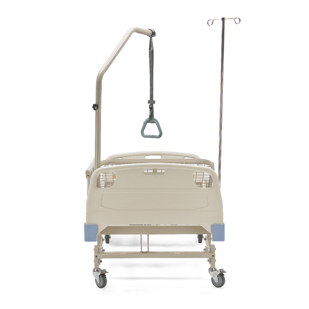 Кровать установлена на четыре прочных маневренных колеса с надежными тормозами. Пациента легко перевезти в другое помещение, а кровать зафиксировать в неподвижном положении. Кровать поставляется со стойкой для капельниц и опорой для подтягивания, которые можно устанавливать с удобной стороны.